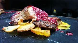 . entrecotte (250 grs) pasado por plancha y luego ahumado en el momento de servir en la mesa, con madera de roble y haya bajo una campana que se levanta en la mesa. Una parte de espectáculo que contribuye para un plato a compartir de una carne troceada pero con un corte no muy adecuado que dejaba algunas partes con tirantez, aunque con buen sabor y punto solicitado. Acompañan unas patatas mejorables de aspecto