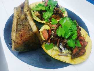 La carta de comidas no tiene (o no se nos ofrece) menú del día que era de la mejor RCP. La carta se presenta en un folio sobre tabla de madera. Las opciones se disponen en unos entrantes frios (6), calientes (8), ensaladas (3), ahumados en carnes (2) y en pescados (2) más unas hamburguesas creativas (2). El pan aparte, por raciones, con opción de pan tostado con aceite y sal negra (1.5€), por cierto muy bueno y repetimos, y en una curiosa presentación dentro de una caja de madera; también está la opción de pan con tomate y allioli (3€) que no probamos. No vimos carta de postres y nos fueron explicados a pie de mesa.