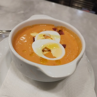 Salmorejo casero con jamón ibérico a 5'90€, el mejor salmorejo de la zona que hemos probado de momento, fresco, gran sabor y buena cantidad.