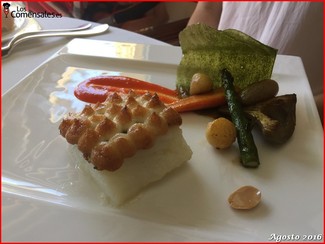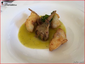─ Cachetes de merluza en tempura, alcachofa de Motril y pil pil. Este plato se sirvió de forma individual a los comensales y la presentación era bastante buena. A mi gusto personal me hubiera preferido que la merluza estuviese un poquito menos hecha.