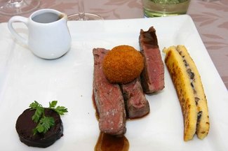 El segundo: Buey con esencia, coca crujiente, apio infusionado con Bergerac tinto… Vino: La gloire de mon père (Château Tour des generes)