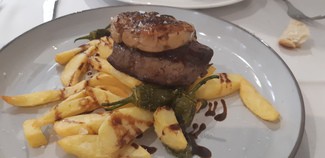 Por último optamos por solomillo de ternera con foie, pimientos de padrón y patatas. El solomillo de calidad suprema y perfecto punto de cocción. Muy sabroso.