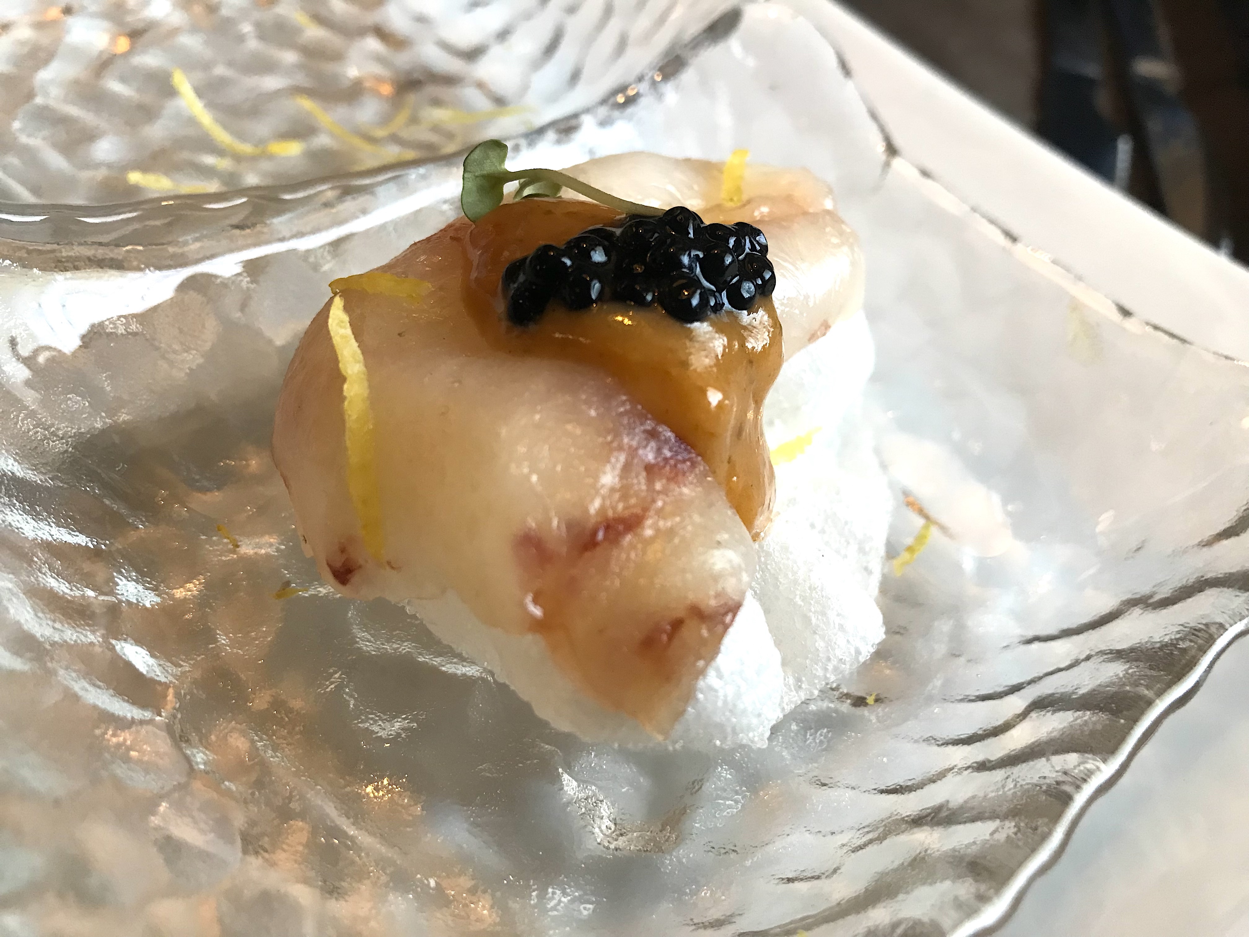 Envuelto en pan tostado, lleva un toque dulce de mango sobre la clásica pipirrana, y nos gustaría con la salsa más chorreante, jeje. También salen 2 bocados de finger. El soplete ahumado me gusta y su presentación enroscada.