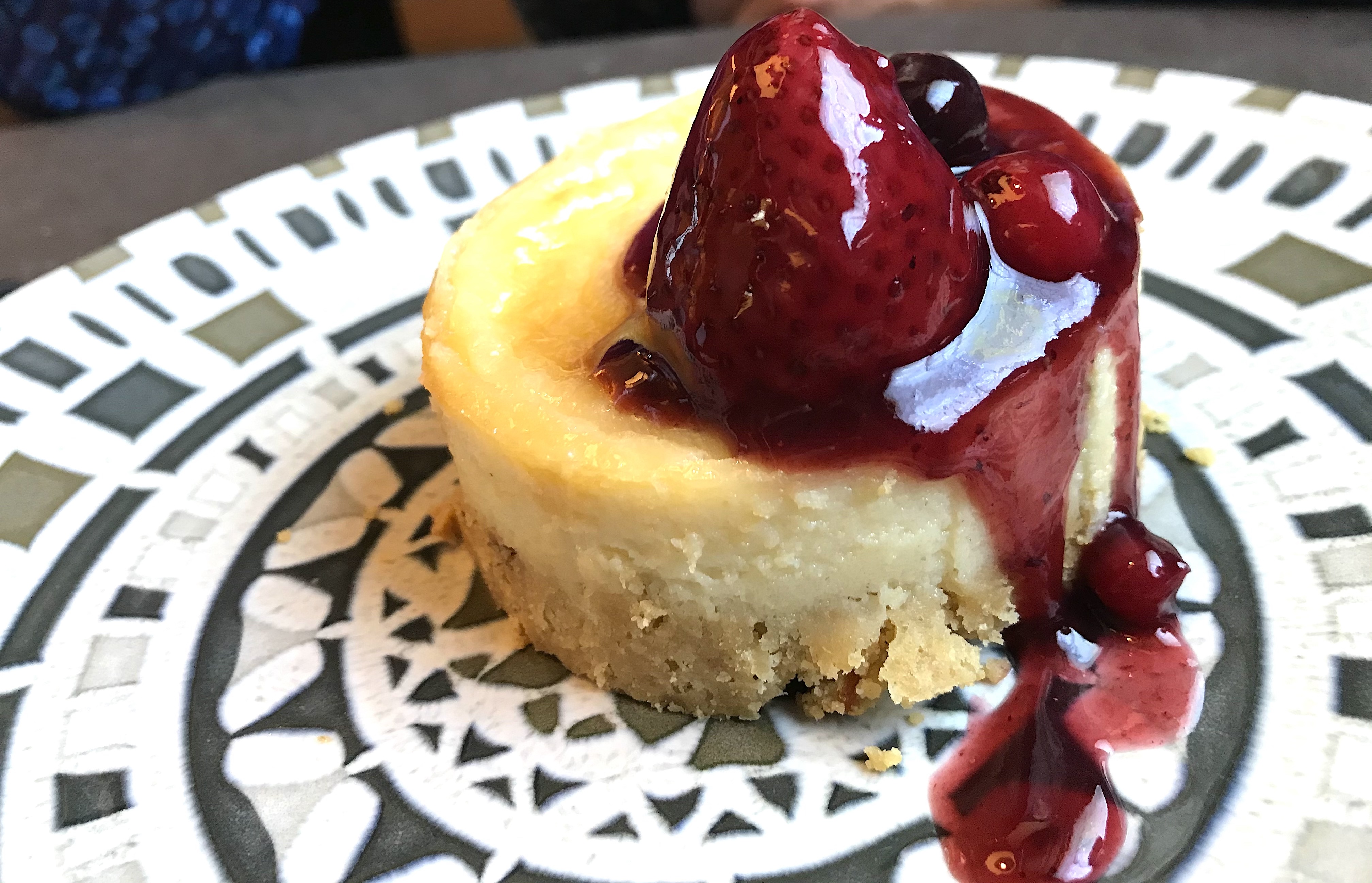 En redondo, con base de galleta con mucha canela, que apodera un poco al queso, que se echa algo de manos, incluso con un poquito de frescura en su Tª. Presentación muy buena con fresa confitada agradable. Solo rebajar un poco de dulzor global. Perfecta armonía con palo cortado.
