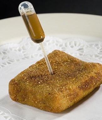 Croqueta quadrada de Calçots con caldo de trufas ( se acompaña de un tubito de plástico con el caldo para que lo pongas detro de la croqueta), original y sabor contundente.