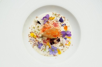 Presentado sobre una pizarra rodeada de flores comestibles nos trajeron Calcots, romescu, topimambo y cerdo. Que puedo decir, a estas alturas ya estábamos encantados, realmente sorprendidos, y agradecidos, por la calidad de los platos y la magnifica presentación, junto a la puesta en escena del servicio explicándonos todo lo que a continuación íbamos a comer. El calcot bien hecho sabroso y con un sabor intenso, de los que llenan la boca y los recuerdos. Junto a un romescu fino y delicado que deja el protagonismo al dueño del plato. El cerdo tierno, sabroso, jugoso y con un toque, especial, las flores tamizadas del hinojo, que dotan al conjunto de frescura y ambiente de campo, de naturaleza. Todo ello sin empalagar sin cansar. El topimambo creo que era la primera vez que lo probaba, resulta original, más por su textura, entre carnosa y crocanti junto a cierta melosidad, buen contrapunto con el resto de los ingredientes del plato.