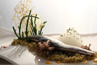 • Delicias de calamar sobre una versión de hummus y coles con cenizas de calçot