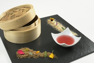 • Croqueta fría de verduras thai, con dashi de mejillones, rebozada en polvo pan de tinta de calamar.
