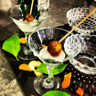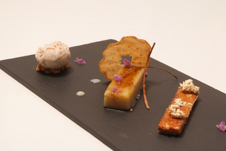 -Postre/s:Cucharillas(2)yema al maracuyá(o algo así)cortesía de la casa y un "espectacular" brownie con frutos secos y helado de turrón con fondo de maracuyá también.Terminado éstos,nos ofrecen también por cortesía de la casa,unos mini cornettes de helados caseros(turrón y vainilla-buenísimos).La cortesía siguió con el acompañante de éstos,un PX Jiménez-Spinola,que recomiendo también que probéis.
