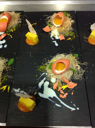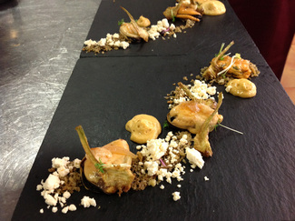 Rápidamente llegaron a la mesa dos platos de jamón ibérico con regañás, jamón que estaba magníficamente cortado y de sabor "para ponerle un piso". Tan es así que pregunté por su pedigrí y me dijeron quese trataba de un Guijuelo, de Bernardo Hernández, que ha sido premiado con el título de "mejor jamón ibérico del mundo" (sic) en la Feria IFFA 2013 de Franckfurt. De los mejores que probé en mi vida, lo puedo asegurar sin empacho. A este manjar le siguieron tres croquetas especiales de la casa (boletus, gamba y chipirón con su tinta) y un foie a la sal y queso de cabra, que llevaban algún sustento más para redondearlos (lágrimas de mermelada para el foie sobre una salsa de brandy, por ejemplo) platos ambos de una gran altura y delicadeza.