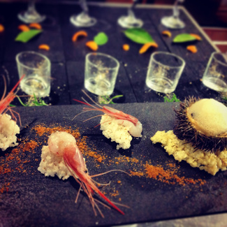 -Ravioli de gamba y cigala(idem.1 para c.u.que probablemente fue lo que menos nos"gustó"sobre todo algun trozo de almendra amarga que seguro que estaba ahí para darle ese toque)