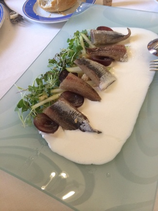 Comenzamos picoteando al centro de mesa una ensaladita de sardina marinada con uvas manzana verde y ajo blanco. También un revuelto de morcilla con piñones.