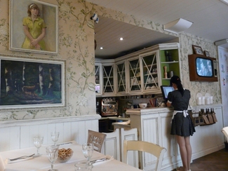 Escondido en una calle no muy céntrica de Moscú, encontramos este restaurante recomendado por la guia de viajes Lonely Planet. Te llamará la atención las decenas de timbres que tienes para llamar a la puerta, que mas que de un restaurante, parece la de una casa particular. La decoración es de una casa clásica moscovita de los años 50, y las guapisimas camareras, también van vestidas de esta época. Hablan algo de inglés, pero no esperes maravillas. Tienen menú al mediodia y carta. Nosotros pedimos, casi sin saber lo que estabamos pidiendo, pero acertamos en algún plato. Lo de los Blinis con caviar rojo, que es tipico en Rusia, pues tampoco es para tirar cohetes. El resto de platos, abundantes y bien elaborados. Pero insisto en que la cocina rusa, no es de las mejores. La carta de vinos esta repleta de referencias internacionales, a precios muy altos y calidad justita. No habia ningún vino de alguna exrepublica socialista, cosa que no entiendo, y por este motivo no valoro este apartado. Se puede pagar con tarjeta, y recomiendo probar la carne, ya que el pescado lo hacen de forma particular, y no me gustó.