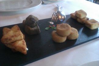 Degustación de postres: souffle de nueces, helado de mandarina, tarta de chocolate y mermeladas. Teja y barrita de chocolates: estando rico todo ello, no me ha enamorado pero uno llega ya un tanto satisfecho a los postres y quizás sin ya tanta hambre se permita ser más exigente. No obstante ninguna pega que mencionar. Un buen postre.