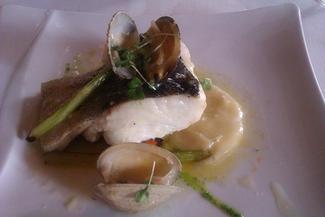 Merluza con espárragos y almejas: buena ración, con un par de almejas de tamaño más que decente. Quizás dos minutos menos de cocción hubiesen bastado pero estaba conseguida. Tostada la piel.