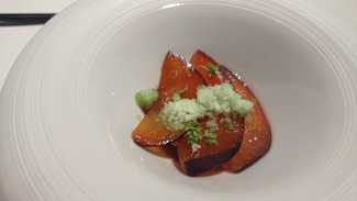 Bonito braseado, pisto, huevo frito y todo ello acabado con un caldo dashi, que hacen con las espinas del bonito tostadas , agua de tomate y alga kombu , a nivel , estábamos disfrutando .