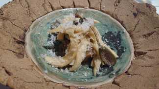 Mollejas, alcaparrón, ralladura de almendra y tallarines, creo que de seta, currado y rico.