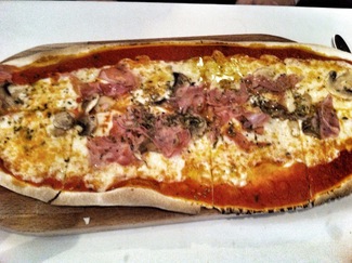 - 4 stagione : Pizza con tomate, mozzarella, aceituna negra, york, bacon y champiñón. Ya se ha mencionado que aquí las pizzas son de masa muy, pero que muy fina y crujientes. Un clásico que sigue ilusionando a alguien como mi chaval y a algún adulto que otro.