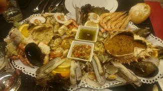 La mariscada se componía, de cuatro navajas, correctas, cuatro mejillones, ricos, unas almejas finas, muy pequeñas, seis gambas cristal, ricas, dos calamaros o cangrejos de rio, correctos, un pequeño buey de mar, soso, sin ningún sabor, cuatro o cinco zamburiñas, más bien volandeiras , creo , puedo equivocarme , correctas también y para rematar un txangurro al horno , soso , con mucha gamba enana congelada y poca carne de centollo y con un mejunje soso y de escaso valor nutritivo , una lastima de mariscada , igual es que si has estado en Galicia comiendo marisco te vuelves especialito , porque aquí presumen de producto y puedo aseguraros que la mariscada que nos pusieron y que tuvimos a mal comernos era de pena , esto con unas ricas trufas caseras y un par de copas de vino , por 70€ para dos personas , si el marisco hubiese estado bien , seria un oferton , así prefiero no adjetivarlo , por respeto a la gente que trabaja y duro en ese restaurante .