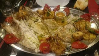 Así que yo no se si es por esto, o porque no lo hacen del todo mal, la parillada de pescado estuvo mejor, una lubina abierta y bien elaborada, para nada pasada, una ventresca de merluza también muy rica y cachos de rape a la romana con salsa americana, patata asada y pimientos de bote y cebolla, también asada , el pescado en su punto , bien , en este caso pagar casi 70€ por la parillada de pescado con sus trufas y sus dos copas de vino , hubiese estado bien .