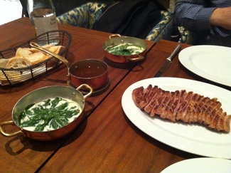Seguimos con un ave entera para compartir, aconsejable para 3 o 4 personas Una Pintada , con una salsa a base de mantequilla de Paris y escalonias criada en semi-libertad con una alimentación 100 % natural (cereales, frutas - particularmente higos - y verduras). Te la presentan entera en la mesa y a continuación te la trinchan. Una de las mejores, si no la mejor que hayamos comido nunca, perfectamente cocinada y de un sabor para el recuerdo, un verdadero placer de dioses. La salsa, riquísima, la pudimos aprovechar al máximo con el excelente pan que acompañó la cena .