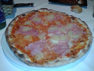 Pizza hawaiana, fantástica, masa fina, y sabrosos productos, 11,50+iva