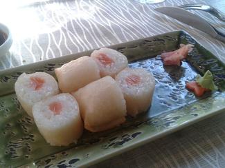 Yakitori de solomillo tres unidades con tres trozos cada una, carne con buen punto, un pelín tiesa quizás pero no en exceso. Sabrosa y sobre todo por esa salsa que le añaden que tiene un gusto muy sabroso. Se acompaña por unos trozos de pimiento verde.