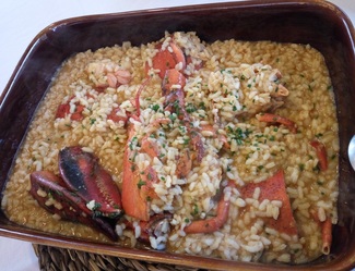 - Arroz meloso con bogavante y fumé de nécoras: Impresionante ración (como para 3 pax) presentada en una cazuela rectangular de barro con un bogavante despiezado y el arroz en su punto. Plato de merecida fama por sabor y tamaño.