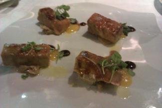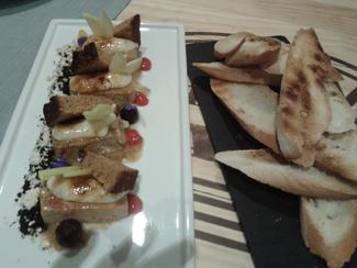 Para las crías unas tortillas francesas con patatas fritas a la postre invitación de la casa, también nos obsequiaron con un aperitivo elegante, turrón de foie con mermelada de fresa, cuatro buenos lingotes con sus panecillos, de categoría.