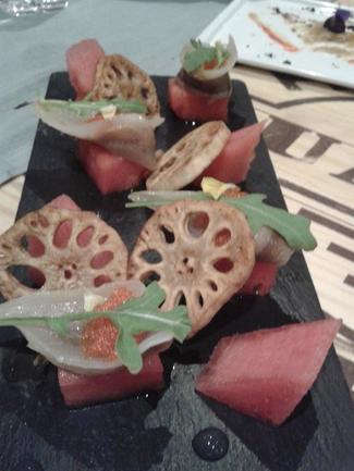 Sandia cru, anchoa del cantábrico, cebolleta asada.