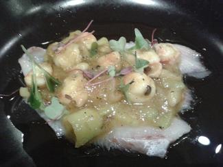 Otro aperitivo con el que nos sorprendieron fueron unas anchoas del cantábrico con caviar y atún confitado, buena anchoa, sucedáneo de muy buena calidad y buen punto de sabor.