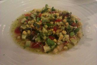 Cebiche de gamba roja de Huelva con aguacate más muesli de maíz, yo lo llamaría más bien un carpaccio acebicheado, por la forma de la gamba, muy rico y fresco.