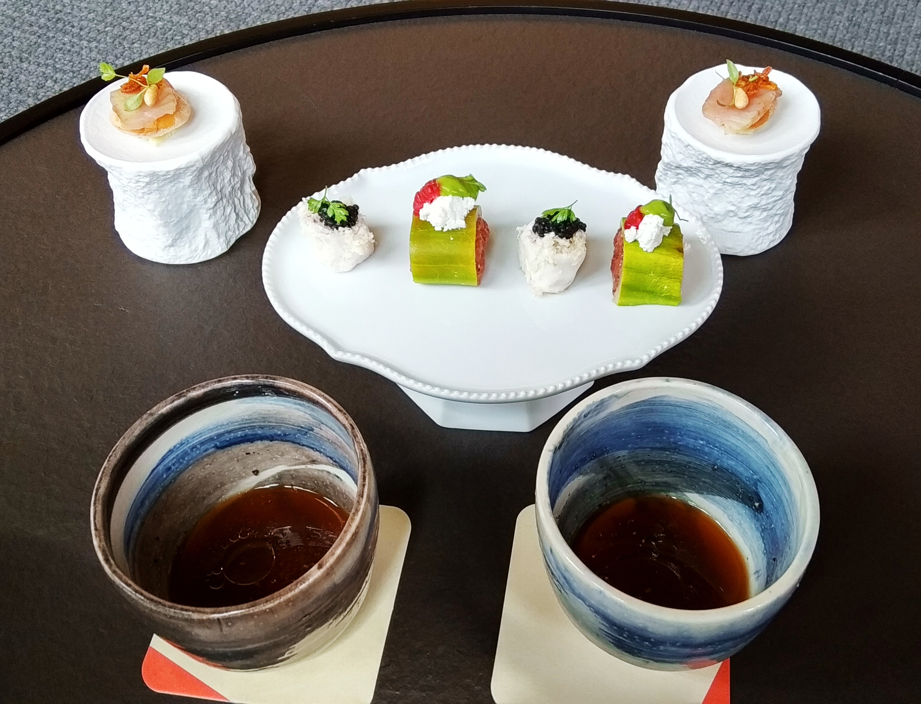 Con todo decidido, seguimos con el menú y se nos presentan los siguientes 4 aperitivos, todos ellos se comen de un bocado: