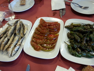 Pimientos del Padrón, perfectos, no picaban 6€ ración, tomate ecológico, sabroso, 7€.
