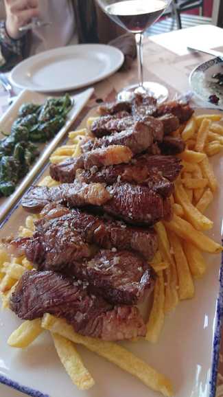 Ricas croquetas de panko y rematamos con un rico entrecot de ternera Gallega, con rico sabor, y unas patatas también ricas, 17€, el pan 0,7€, y unos canutillos rellenos de crema y una filloas rellanas, que no nos cobro, destacar el nivel de producto y la mejoría en la cocina respecto a mi primera visita.
