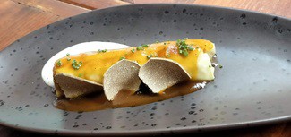 - Canelón de rustido de pularda de corral con trufa de verano y foie, bechamel y el jugo de su rustido (12 €) - Delicioso, aunque la trufa la encontramos insípida. 15:02 h.