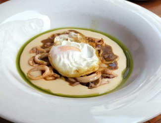 - Parmentier de patata con calamares, huevo frito y aceite de ajo y perejil (20 €) - Lo pedimos a sugerencia del sumiller. Todos nos preguntamos qué aportaba el calamar más allá de la textura. 15:22 h.