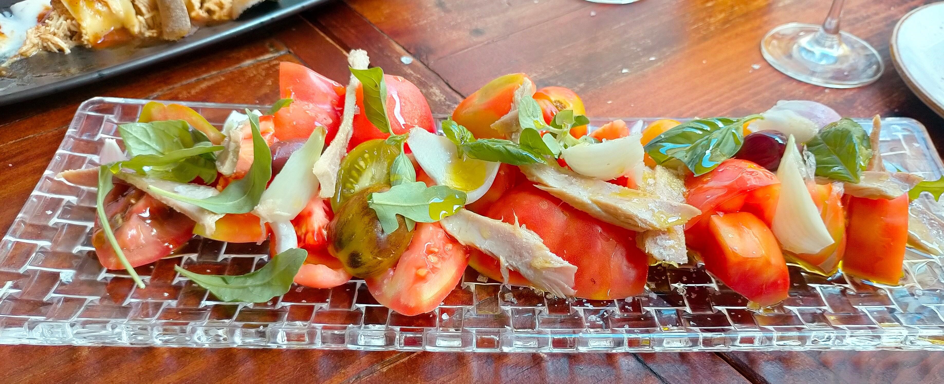 - Ensalada de tomate y ventresca de bonito con cebolla y olivas Kalamata (14 €) - Diferentes variedades de tomate. Ligera y fresca. Dos olivas tenía. No nos gustó que fuese el cuarto plato. 15:05 h.