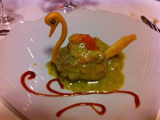 * Cola de gamba a la diabla con salsa de cangrejos (lo que menos me gusto, el rebozado de aceite muy pesado).