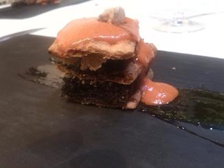 Milhojas crocante de morcilla y salsa de piquillo , morcilla de verdura de la zona , potente , quizás para mi gusto , sobraba el foie que le pusieron por encima , era poco pero ya era un plato contundente y graso por demás.
