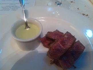 Láminas de entrecot a la brasa muy tierna la carne, con mucho sabor, punto ideal de sal. Nada que objetar. Acompañado de una crema de queso que yo, para variar, me he comido con cuchara antes de la carne. A mi la carne me gusta sola, sin acompañamientos que me engañen.