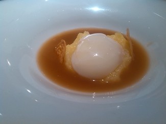 El tratamiento del foie es sencillamente sublime en el foie gras de pato asado y caldo yodado de anguila. Resulta casi ligero, tremendamente desgrasado, pero manteniendo su textura untuosa. La potencia yodada de la anguila le aporta un toque salino de gran finura. Sobresaliente.