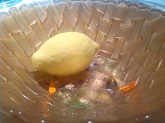 Cigala a la plancha con piel de limón escarchada y caldo de sepia y garbanzos