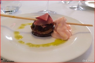 ─ Timbal de verduras en texturas con bonito. 8/10. El timbal de verduras está muy bien presentado, todas las verduras tienen un punto muy bueno aunque la espuma de tomate que acompaña me pareció un poco floja. Mención especial para el atún que acompañaba al plato y que nos encantó.