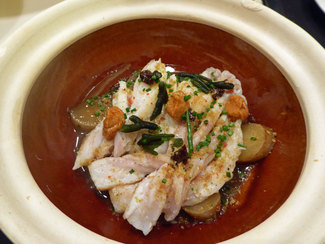 Raya con patatas ratte guisadas, romesco, ajo negro y polvo de picada