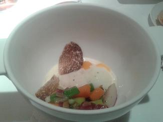 - Cigala envuelta en panceta ibérica con carpaccio de trufa y patata limón: El mejor de los entrantes, pura filigrana de sabores con una cigala de hermoso tamaño, a la que la panceta aportaba un toque ahumado. Si a esto unimos la patata cocida al limón con lascas de trufa, la combinación es una explosión de sabores de la que se puede decir que lo peor es que se comía en 2 bocados. Platazo que justifica una visita. La original iba con piperrada y no con patata limón.