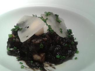 - Risotto de arroz negro con carpaccio de queso Idiazábal y un toque de all-i-oli: Arroz bien de punto con bastantes trozos de chipirón, unas finas láminas decorativas de Idiazábal y una gota de salsa, que combinaba muy bien con el plato. Correcto, pero sin emocionar. Aquí cambiaron totalmente el plato, que iba a ser un revuelto de hongos con foie-gras asado y jugo de pato.