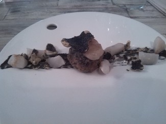 Como deferencia, me sirvieron una Croqueta de chocolate líquida con helado, licor, trocitos de brownie, sirope de chocolate. La croqueta interesante pero no repetiría en una próxima ocasión.