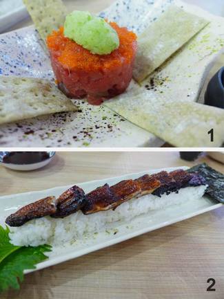 Por el tono desesperado de la pregunta, la empleada advierte perfectamente que lo que realmente le quería decir era: “Por favor, por favor, no me jodas que llevo toda la semana sin pensar en otra cosa”. Asiente con la cabeza y respiro aliviado, ya podemos pasar al resto. Nos aconseja el “plato estrella”, la anguila y aceptamos. También hemos leído sobre el tartar de atún, así que lo pedimos y completamos con un futomaki y unos niguiris. Un par de Turias acompañaran la comanda.