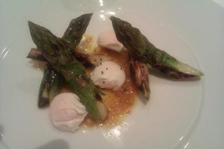 - Espárragos verdes con salsa de anacardos: varias yemas de espárragos de tamaño considerable y punto muy conseguido sobre la salsa y acompañadas de otras yemas, en este caso de huevos de codorniz “poché”.